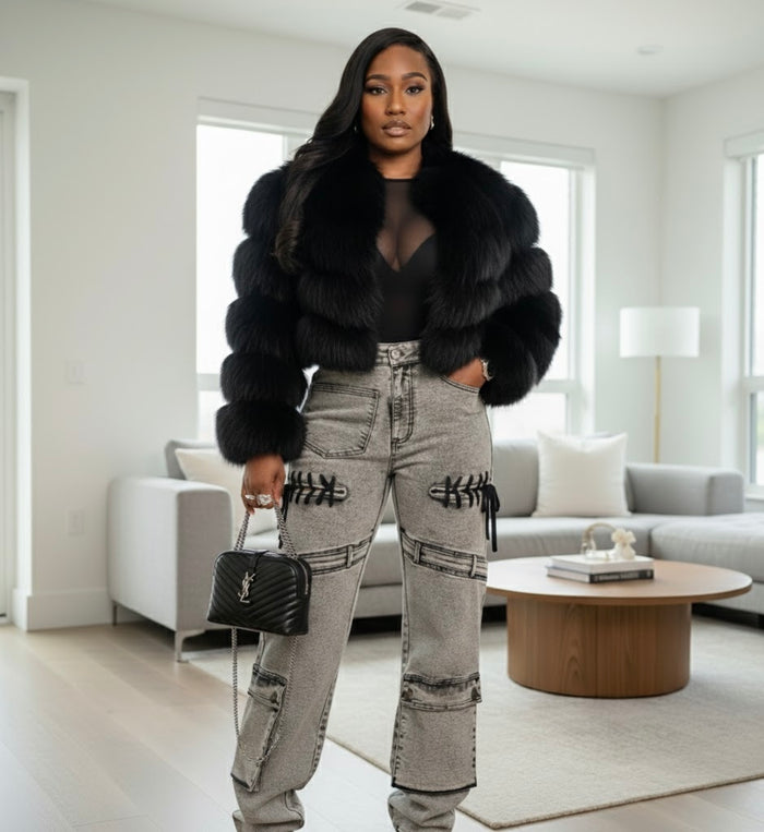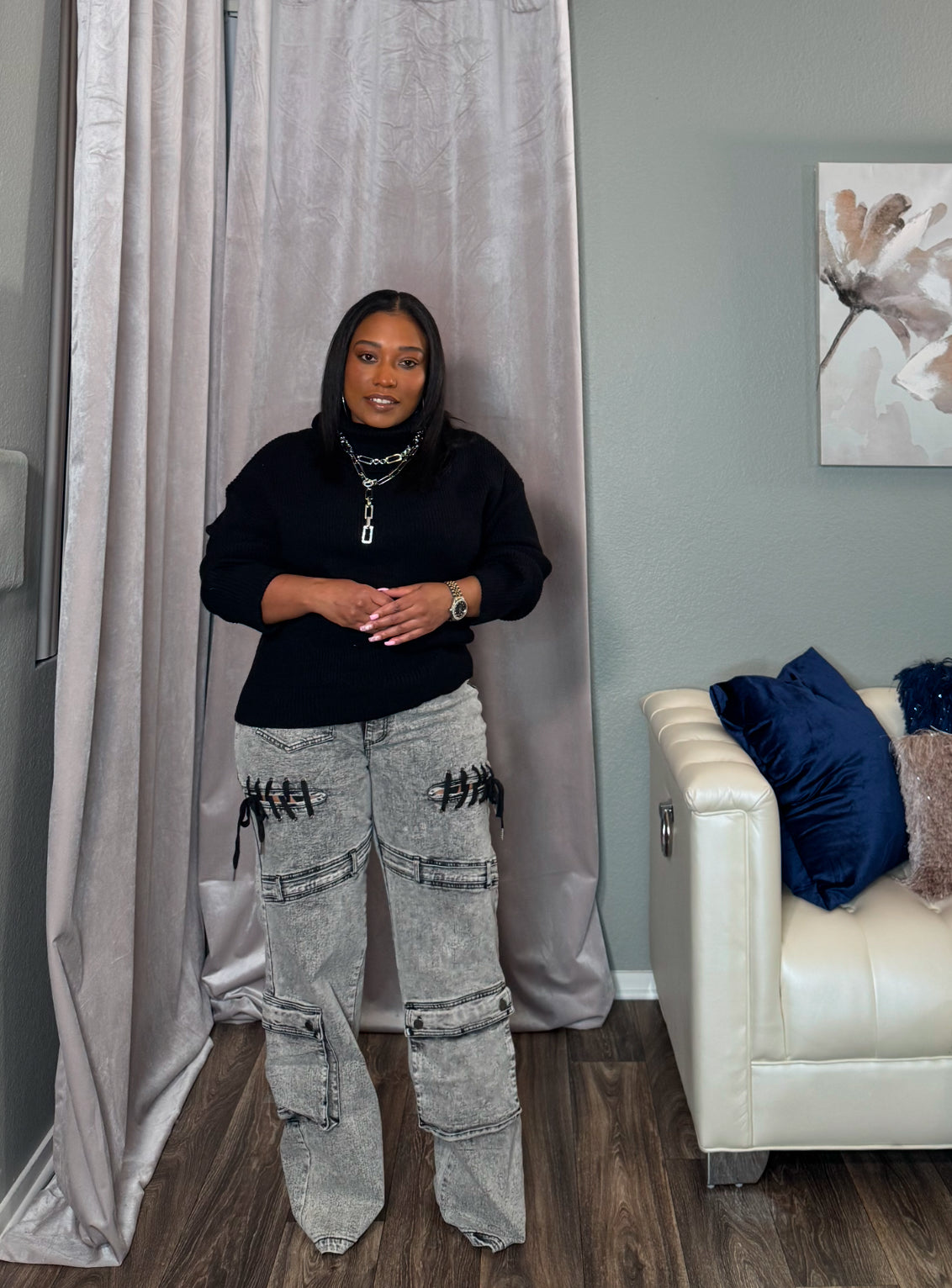 Rock a laid-back vibe with these high-waisted cargo jeans in soft gray wash denim. Built with just enough stretch to keep you comfy all day, they feature a classic button-zip front and playful string accents that give major style points. Perfect for effortless, casual looks that feel as good as they look.