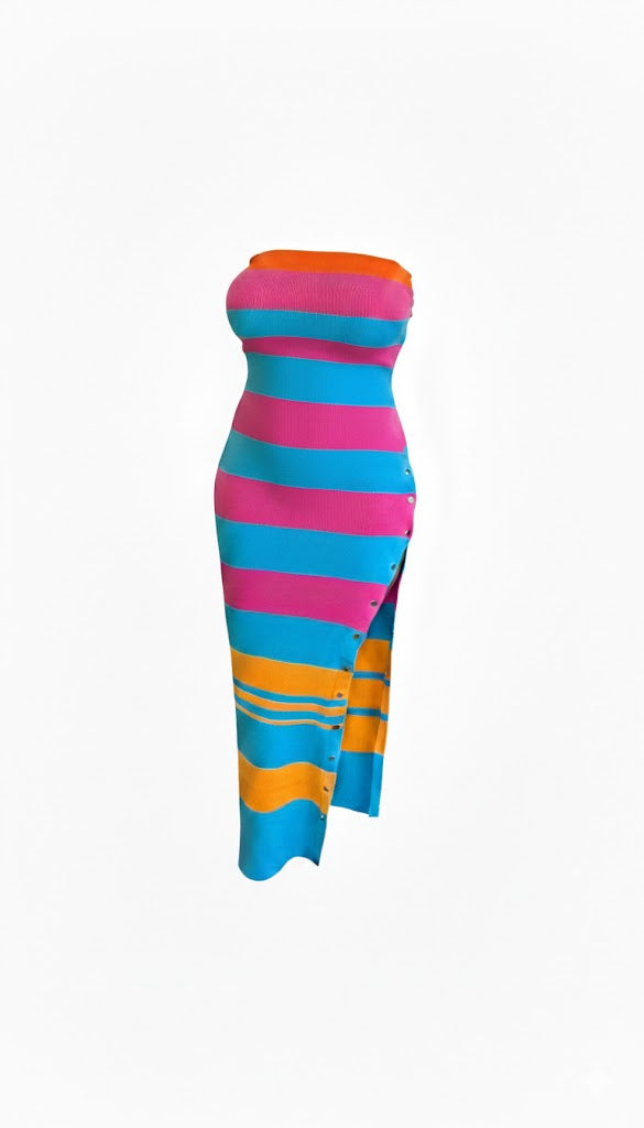 This striped knit tube dress features functional side buttons and a stretchy, high-quality ribbed knit construction. Versatile for both daytime and evening wear, pair it with a stylish heel or a cute sandal. Built to last, this dress is a fashion staple.