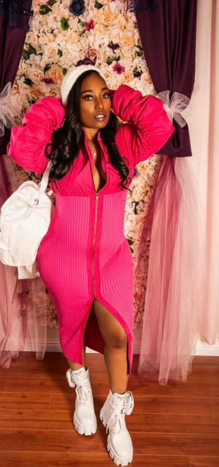 All year long is a season for pink!! This puffer-sweater midi dress comes with a zipper closure and thumb holes for extra comfort and ease. The garment has a stretchy knit fabric, ensuring its true size. Rock it casually or dress it up for any event and stand out with style.